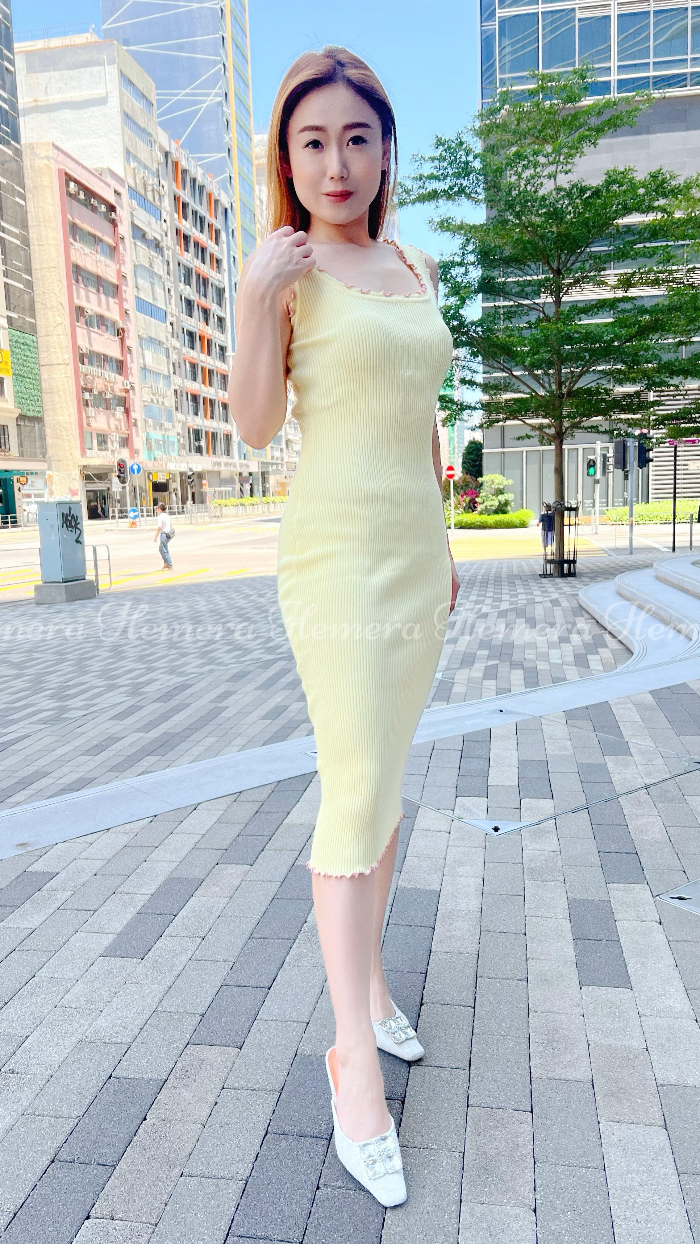 雞仔黃簡約ruffles方連身裙